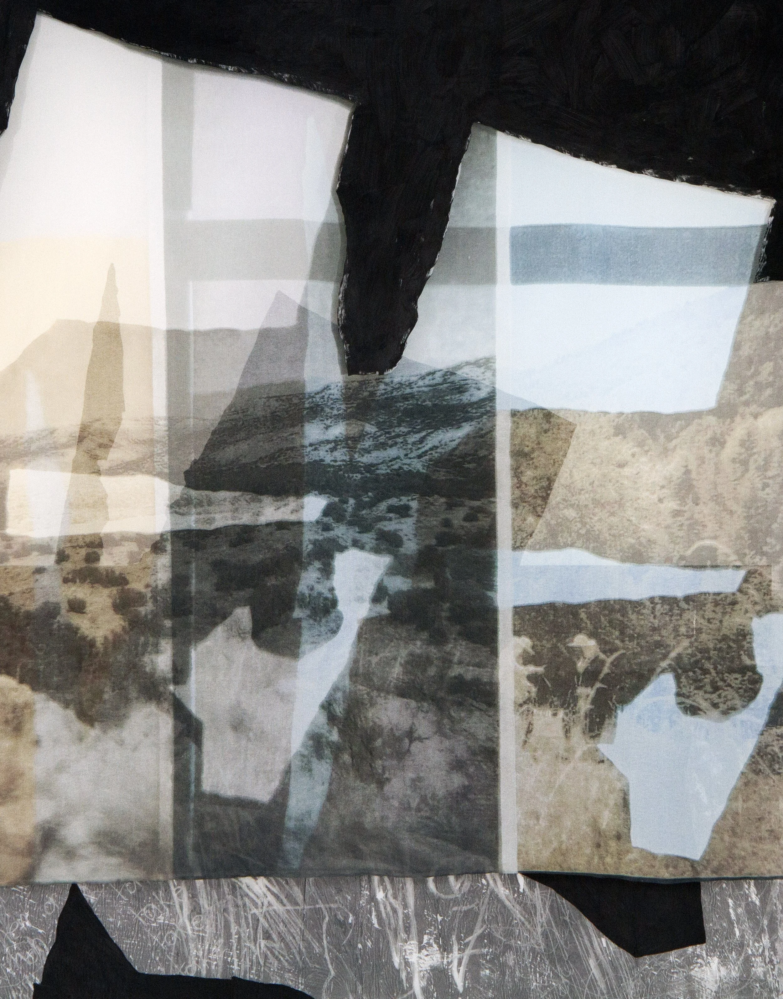 I generate work out of life’s daily residue: my toddlers’ drawings, school phonics, and Viber chats across the ocean. This sequence of diorama forms is composed of fragments from a made-up picture alphabet. The letter-like symbols are based on my toddler’s paper clippings-shapes reminiscent of an ancient hieroglyphic language. Every diorama began with a layer of printed chiffon. In response, I composed pieces using painted drafting film and graphite drawings. The layering process embraces improvisation and chance. I traced fragments while they were suspended in the air, painted see-through shapes in black gesso, and cut material in accordance with the emerging image. The process felt like I was stitching a garment in real time for a body without specific dimensions. The letter-like symbols repeat like reverberations throughout the diorama form. I see this ricochet effect of bouncing shapes, incompletely registered but still there, as a metaphor for the life of languages in diasporic spaces.